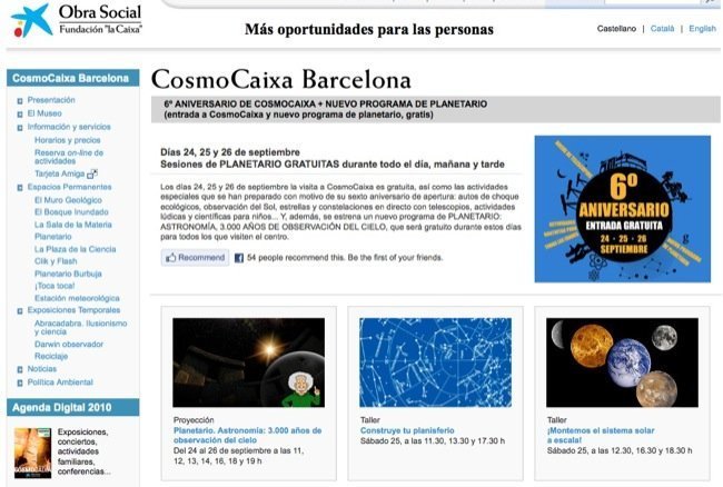En este caso es CosmoCaixa Barcelona que celebran así su sexto aniversario, con talleres de reciclaje, de observación del Sol, estrellas y constelaciones en directo con telescopios, actividades lúdicas y científicas para niños, visitas comentadas…