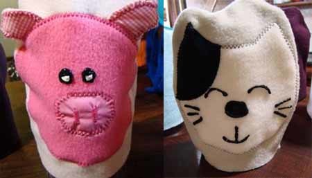 Nos enseñan a hacer los moldes y nos explican cómo debemos armar las manoplas para que parezcan animales. La primera tanda incluye perros, un cerdito, gallinitas, un cocodrilo, un gato, un pollito, un pez y hasta pulpos, uno más bonito que el otro.