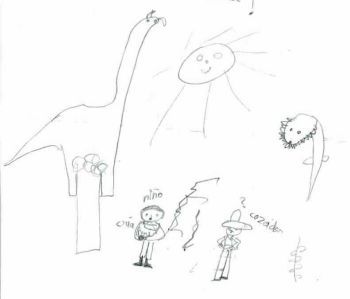 Y Billy vio una cria de apatosaurus que venía con su reloj, pero su reloj ya no sonaba y tenía que arreglarlo. Lo arreglaron la cría y Billy. Tardaron semanas. Apareció un señor que cazaba dinosaurios y Billy tocó su reloj y aparecieron Billy, el dinosaurio y el cazador a casa de Billy. El cazador iba a cazar a la pobre cría, pero era tan mono que se arrepintió y se la quedó para cuidar de ella.