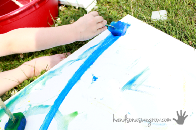 Consiste en llenar una cubiteras o moldes para polos con pintura de dedos, añadirle un palo para sujetarlos y luego congelarla. Sirve también sino tenemos pintura de dedos, cualquier otro tipo de pintura apta para niños que podamos diluir en agua, o colorante alimentício, eso si, este último sale peor de la piel y la idea es que no tengamos a los niños en modo multicolor todo el fin de semana.