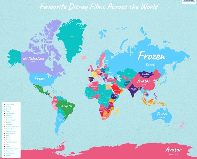 Si observamos el mapa elaborado por Parkdean Resorts, 'Frozen' es la favorita en países como Estados Unidos, Argentina, Chile, Australia, Rusia, Ucrania, Serbia y por supuesto, en Finlandia y Noruega.