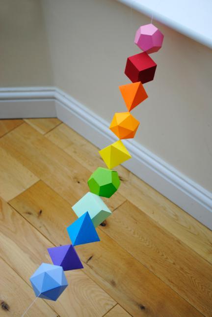 Está compuesta por cinco poliedros (la palabra viene del griego, poli- significa "muchas" y -edro significa "cara"), es decir formas geométricas de muchas caras, que se pueden repetir las veces que necesitéis, según el largo que deseéis para la guirnalda.