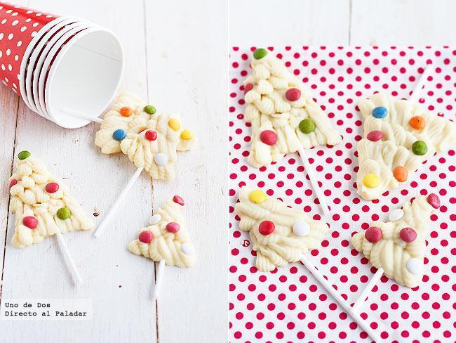 Otra propuesta de nuestros compañeros de Directo al Paladar son estas piruletas de chocolate hechas con forma de árbol de Navidad, ¡me encantan! Sólo necesitamos unos palitos, chocolate blanco fondant, caramelos de colores, manga pastelera y boquilla (sin boquilla también lo podéis hacer, cortáis la punta de la manga de la medida que queráis que salga el chocolate y listos).
