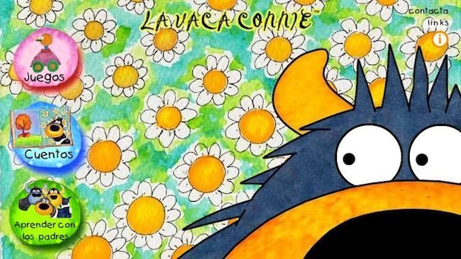 La página de la vaca Connie se divide en tres apartados: cuentos, juegos y "Aprender con los padres". Podemos acceder a ella en castellano, catalán o gallego, y esto es lo que encontramos en cada parte: