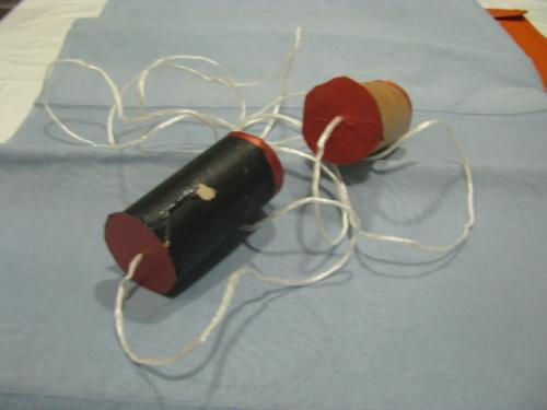 Una vez pintados con acrílicos haremos un agujero pequeño en la base de nuestros cilindros y pasaremos por ellos un cordel, preferiblemente de fibra orgánica, como el esparto. Hay que hacer el agujero del tamaño exacto para que pase el cordel sin dejar huecos. La cuerda, nuestro cable de transmisión, la ataremos con un nudo en la parte interior del cilindro.