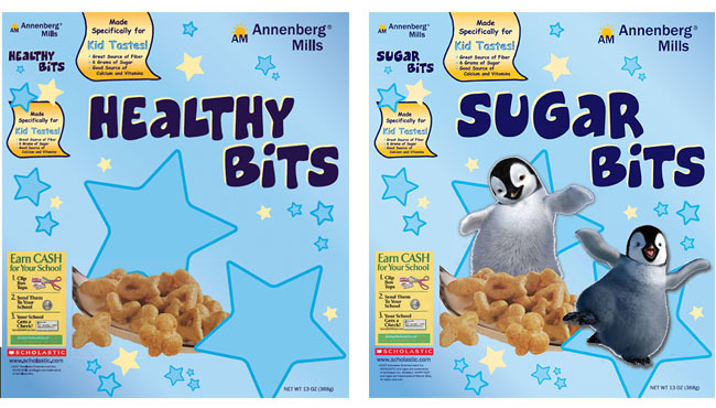 Pues bien, investigadores de la Universidad de Pennsylvania decidieron hacer un estudio para saber hasta qué punto el aspecto de una caja de cereales podía influir en el gusto de los mismos. En una caja escribieron que sus cereales eran sanos (healthy) y en la otra que eran azúcar (sugar), pero con la imagen de los pingüinos de Happy Feet. Luego además hicieron cajas con los pingüinos y la palabra “sanos” y sin los pingüinos y la palabra “azúcar”. ¿Cuál creéis que les gustaron más? (qué pregunta tan tonta).