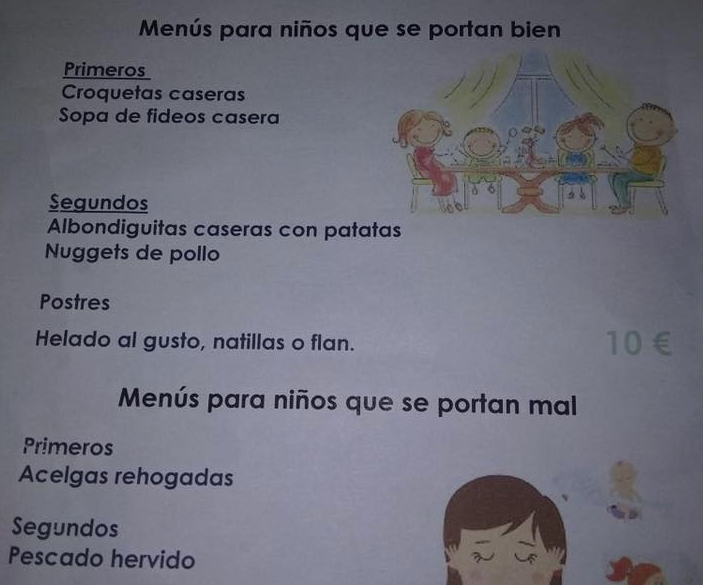 Cuando Sara Gómez, enfermera y madre, leyó el extraño menú de una cafetería, se llevó las manos a la cabeza. En él podían leerse dos tipos de menús infantiles: el dirigido a "los niños que se portan bien", y el de "los niños que se portan mal".