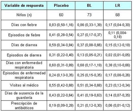 Como se aprecia en el cuadro las fórmulas con probióticos tienen clara incidencia en el número de episodios de diarrea y en la duración de las mismas, teniendo una repercusión poco significativa en las enfermedades respiratorias.