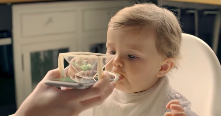 El último invento de Nutribén, marca especializada en alimentación infantil, es una malísima idea. Se llama Nutrispoon y se trata de una cuchara con soporte para el móvil que, al instalar una aplicación, proyecta imágenes holográficas mientras se le da de comer al bebé.