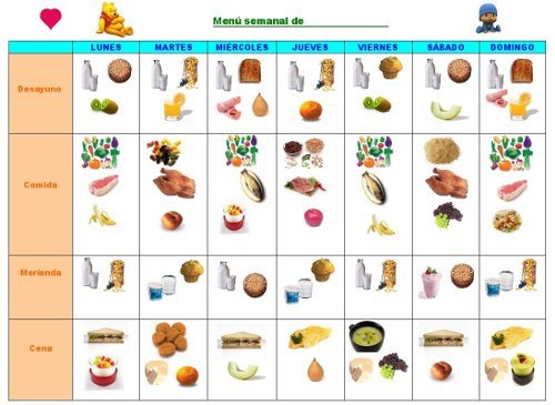 El menú infantil completo podéis leerlo desde aquí, para saber exactamente cuáles son las correspondencias de los dibujos, aunque muchas son fácilmente reconocibles, como las frutas o los lácteos. Pero así nos fijamos en qué tipo de cereales son los más adecuados, o la variedad de pescados y carnes...