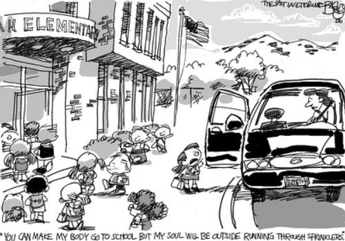 Finalmente, desde ORCA: Observar, Recordar, Crecer y Aprender, nos traen la curiosa y graciosa viñeta que encabeza esta entrada, donde un niño le dice a su madre: “Puedes hacer que mi cuerpo vaya al colegio, pero mi alma estará ahí fuera corriendo entre los aspersores”.