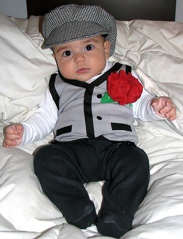 Realmente se lo ve precioso y muy castizo con su chaleco, su gorra a cuadros y el detalle del clavel rojo.