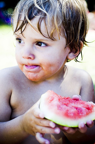 Recién ayer nuestros compañer@s Velsid nos hablaban de una campaña promocional durante el verano, para el consumo de fruta de temporada, ya que en muchos hogares el consumo de frutas sobretodo en la población infantil es muy bajo. Por eso me pareció apropiada para la foto de la semana, la de este niño comiendo un refrescante trozo de patilla (sandia), posiblemente después de un baño de piscina o de playa.