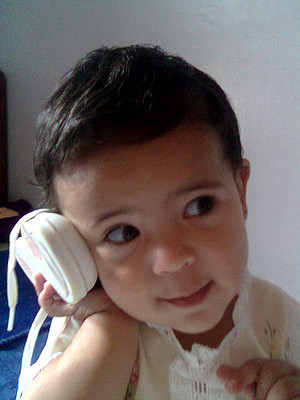 Esta es la foto de Sophia Antonella, que tiene como juego preferido el hablar por teléfono... ¡o todo lo que se le parezca! Así la vemos en esta imagen, con una zapatilla improvisando alguna conversación. A juzgar por su graciosa mirada, de verdad se lo debe de pasar en grande.