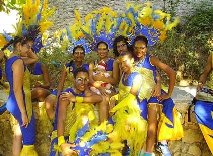 Cuesta un poco identificarla, pero camuflada por tanto colorido, en el centro de la imagen se puede ver a la pequeña Luz del Sol de tres meses en el carnaval de Barranquilla, Colombia.