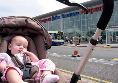 Así hicieron sus padres con Silvana, la pequeña de podemos ver paseando cómodamente en su cochecito frente al aeropuerto John Lennon de Liverpool.