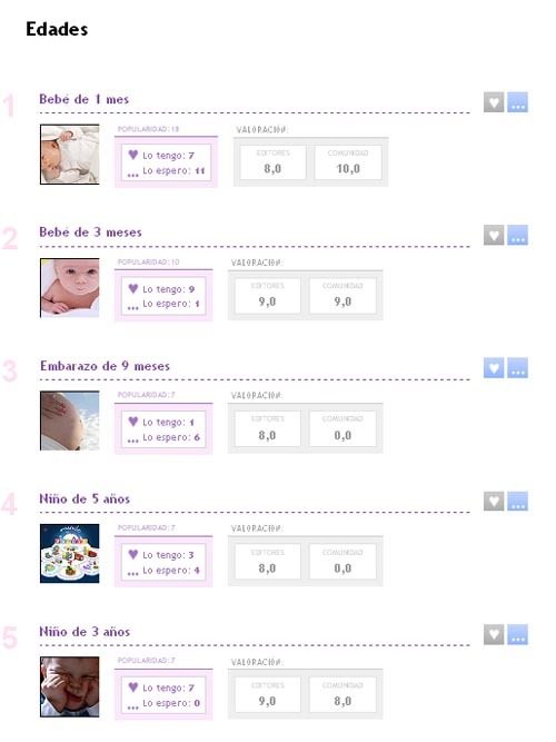 Pues bien, una cosa que se echaba de menos y que a partir de hoy ponemos en marcha es tener un índice de las edades. Se puede acceder a ella pulsando el botón "Edades" situado en la parte superior derecha del blog, en la cabecera de Bebés y más. Encontramos allí todas las etapas del niño ordenadas por popularidad según la cantidad de votos recibidos.
