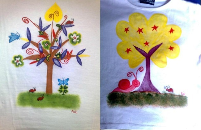 Los Arbolitos de Colores se pintan en camisetas y bolsas, sin patrones, completamente personalizadas y únicas, en telas de algodón 100% preferentemente orgánico y con pinturas especiales para tela.