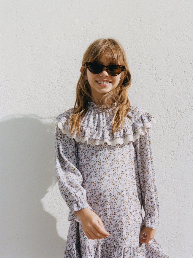 Vestido lila de print floral y cuello redondo con babero de volantes. Su precio es de 22,95 euros.