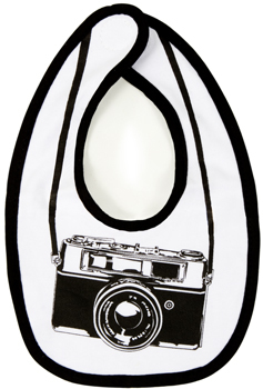 A mí que me encantan las fotografías y que siempre voy cargada con mi cámara me ha parecido magnífico este babero para pequeños fotógrafos, Camera Baby Bib. Es un babero que tiene como diseño una cámara de fotos.