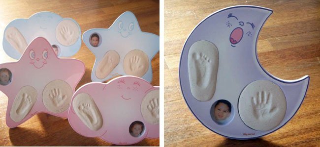 Es una original manera de tener para siempre un recuerdo de cómo eran sus manos y sus pies tan pequeñitos al nacer, acompañados de una foto de su carita.