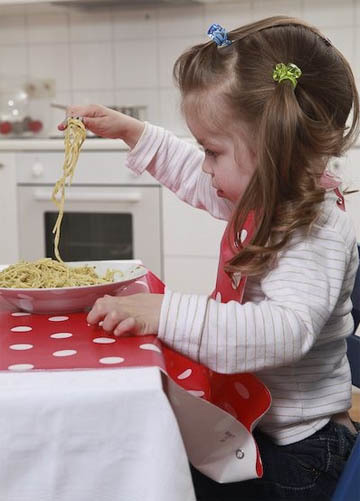 Es un invento muy simple a la vez que práctico siempre que el niño se quede más o menos quietecito. En cuanto se mueva demasiado el plato de spaguettis que está encima del mantel podría volar por los aires. Pero también podría volar sin el babero, claro está.