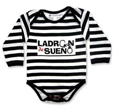 Pero como esos despertares son sanos, necesarios y beneficiosos, pues lo mejor es tomárselo con paciencia y humor, y a esos pequeños "ladronzuelos" de descanso les quedaría estupendamente este body con las típicas rayas de presidiario en el que se puede leer el estampado "Ladrón de sueño".