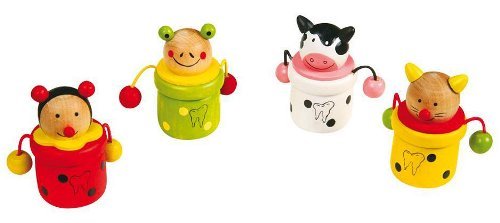 Como veis tienen forma de animales, hay cuatro modelos diferentes: ratón, rana, vaca y gato. Cada caja vale 1'50 euros, y están decoradas en vivos colores y la silueta de un diente que nos recuerda su función. Son cajitas de madera que se enroscan, y tienen como adorno dos brazos de hilo a los laterales.