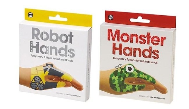 Se trata de unos tatuajes temporales, pegatinas adaptadas a la forma de la mano para convertirla en un robot, un dinosaurio, un monstruo o un animalillo. Hay estos cuatro modelos: Robot Hands, Monster Hands, Dino Hands y Animal Hands, para que escojan el que más les gusta, o varios de ellos.