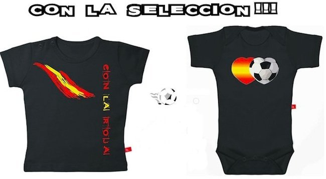 Y si ya teníamos al bebé equipado con un chupete de la selección, unos nuevos complementos uniforman a los pequeños: los bodys y camisetas de apoyo a la selección española.