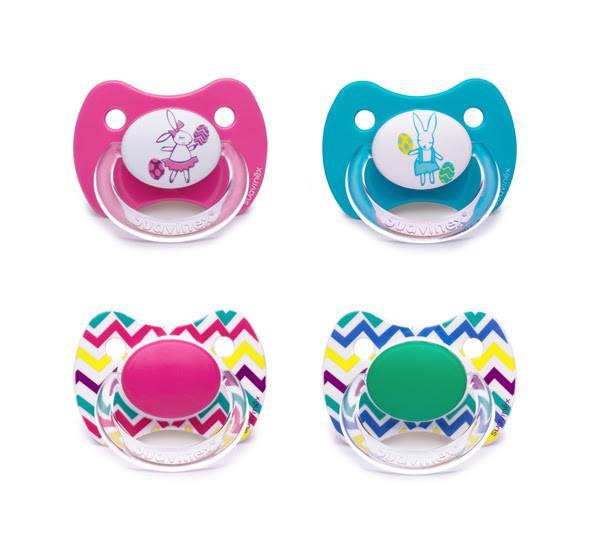 Los chupetes se pueden comprar exclusivamente por Internet en la tienda online hasta el próximo 22 de abril y consta de dos nuevos chupetes en azul y rosa con divertidos conejitos y huevos de pascua y otro modelo con un estampado multicolor a rayas.