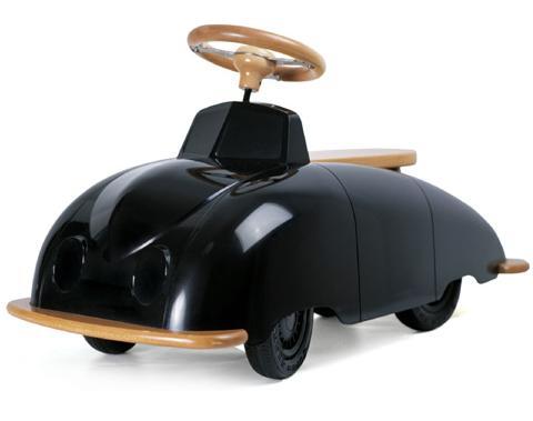 Su lustroso chasis está inspirado en el primer roadster Saab, el prototipo 92001 de Sixten Saxon, y está fabricado en plástico resistente, madera y acero. El coche mide 94 cm y el volante, al igual que en los antiguos coches deportivos, es de madera con detalles de acero.