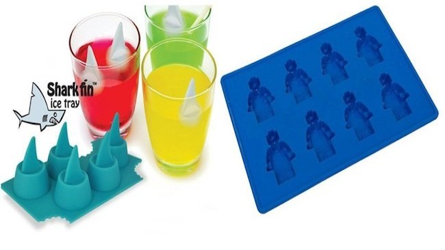 Los moldes de silicona hacen posible estos cubitos con formas diversas, como la amenazadora aleta de tiburón sobresaliendo del rico zumo. Como para no imaginar historias divertidas mientras beben... Y los amantes de Lego tienen la oportunidad de sumergir sus muñecos helados en las bebidas con estos cubitos: ¡hombre (o robot) al agua!