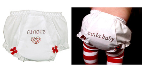 Tenemos dos versiones, la que pone "Amore" junto a un corazón y la versión navideña "Santa Baby", ambas adornadas con unos bonitos lazos rojos y con un ribete de puntilla. Las letras se forman con pequeños cristalitos brillantes, y ambos modelos se fabrican en cuatro tallas, desde recién nacido a los 2 años. ¡Seguro que el cubre pañal "Santa Baby" sería un complemento ideal para el bebé equipado a lo Papá Noel!