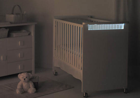 En la parte frontal de la cuna se ha instalado un juego de LEDS que proporciona una ligera luz indirecta que no molesta al bebé.