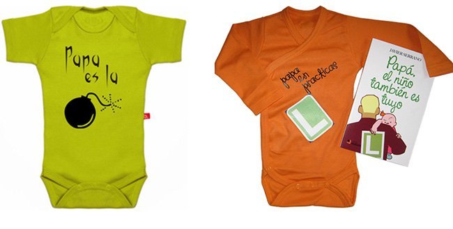 En lugar de darle un regalo tradicional podéis optar por algo diferente vistiendo al bebé con uno de estos coloridos bodys con leyendas como "Papá, es la bomba", "Princesita de papá" o "Papá en prácticas", un modelo que incluye un divertido libro titulado "Papá, el niño también es tuyo" y una tarjeta de felicitación personalizable.