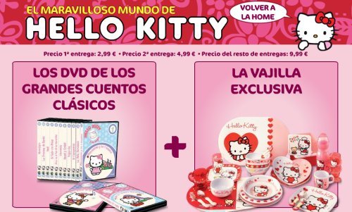 Se trata de una serie de 39 DVDs con los cuentos clásicos como Blancanieves, la Bella Durmiente, el Gato con botas, Pulgarcita, Hansel y Grettel… interpretados por la gatita Kitty. Además la colección consta de una vajilla de 39 piezas de 3 diseños diferentes, todos bastante rosas, esos sí.