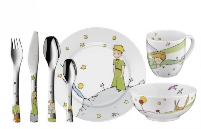 Se trata de un diseño de la marca Auerhahn, con cubiertos en acero y vajilla de porcelana, grabado con los entrañables motivos de El Principito. El set completo se compone de tenedor, cuchillo, cuchara, cucharilla, taza, plato y cuenco.