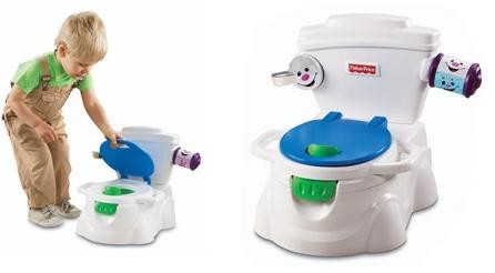 El inodoro de Fisher Price emite el sonido al bajar la manivela como si se hubiera tirado de la cadena, también suenan canciones alegres que animan al pequeño en su aprendizaje diario.
