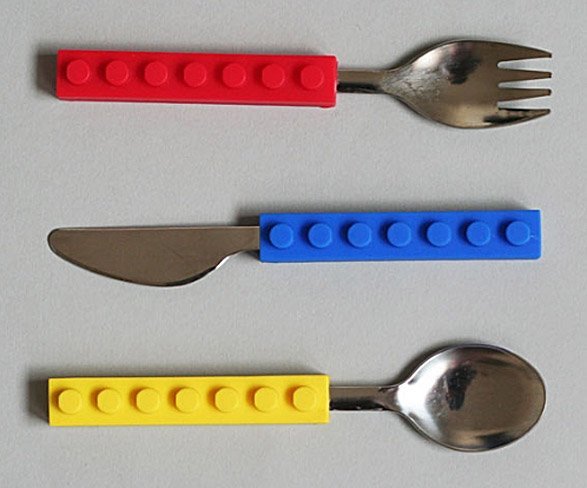 Lo último que he tenido ocasión de ver es este curioso juego de cubiertos de Lego, formado por una cuchara, un tenedor y un cuchillo. Los mangos son de silicona, pueden meterse en el lavavajillas y lo mejor, y lo más lógico, es que pueden unirse unos con otros.