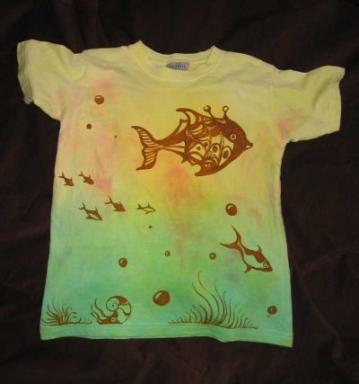 El principio de realización es simple, según dobles o arrugues la camiseta mientras tiñes se obtienen diferentes efectos con los colores. Éstas en concreto luego fueron pintadas a pincel, con pintura para tela con los temas q me sugerían esos efectos y esos colores: el fondo del mar y un vendaval de flores de almendro.