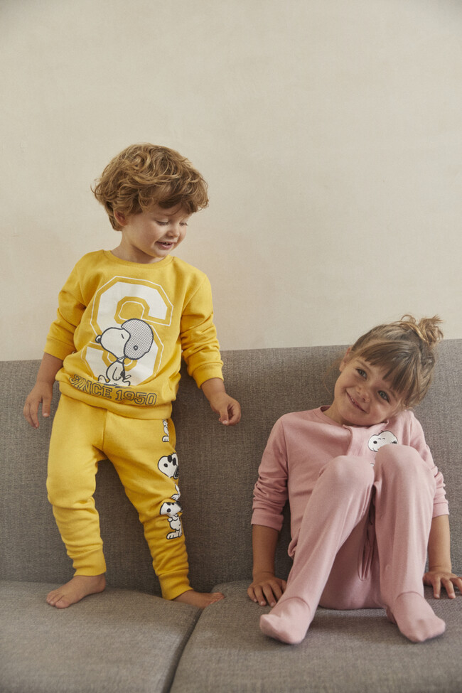 Niño: conjunto de sudadera y pantalón en color amarillo con estampado de Snoopy 14,99 euros. El pantalón por separado 9,99 euros. Niña: pijama que cubre los pies y se puede abrir con completo por delante para el cambio de pañal. Pack de 2 pijamas 11,99 euros.
