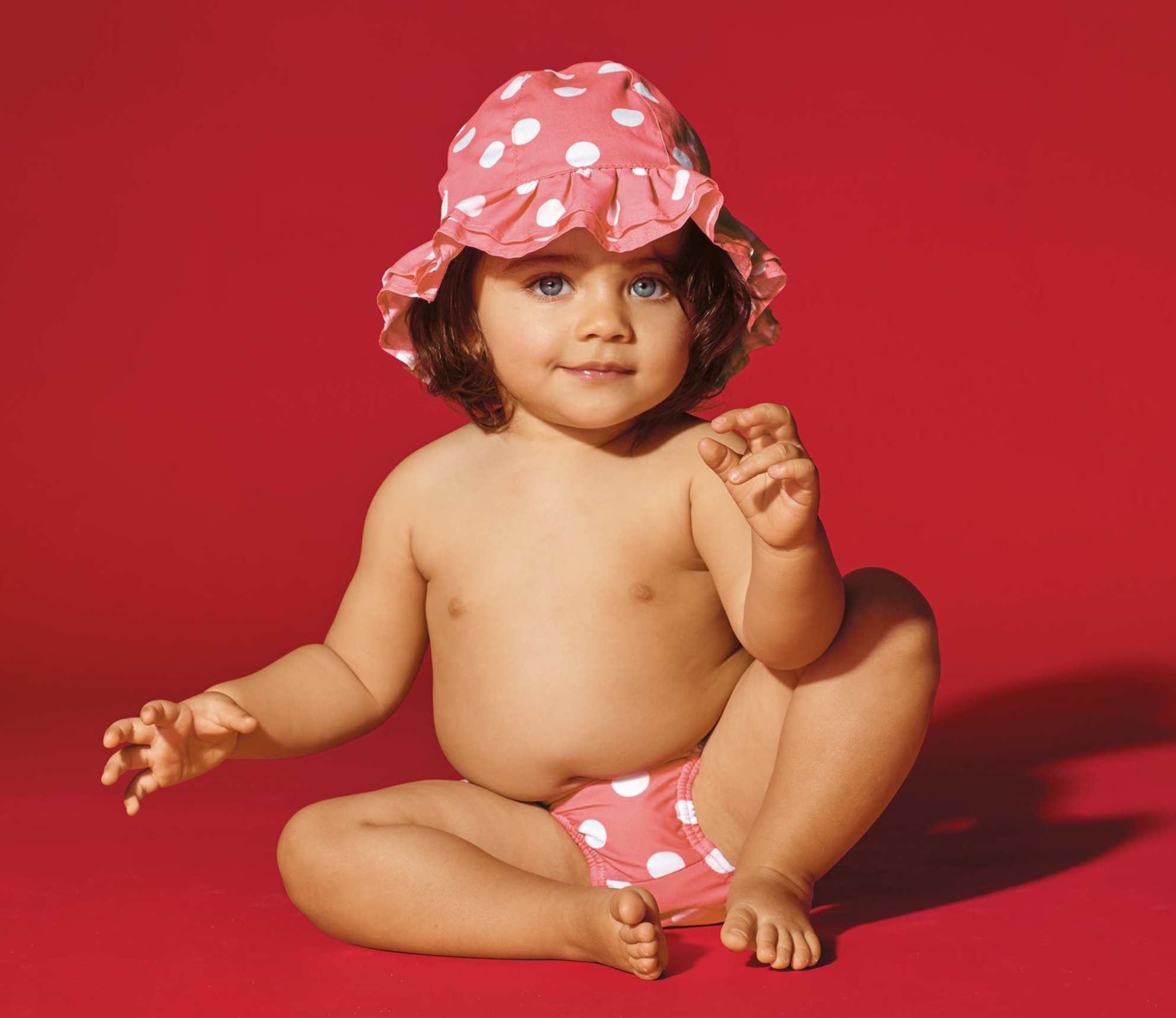 El estilo marinero siempre es tendencia. Elige, por ejemplo: un bañador para bebé de corte ceñido con goma elástica a la cintura con ribete de color rojo y estampado de estilo marinero con barquitos, cangrejos, anclas... en azul, blanco y rojo. De C&A, por 6,90 euros.
