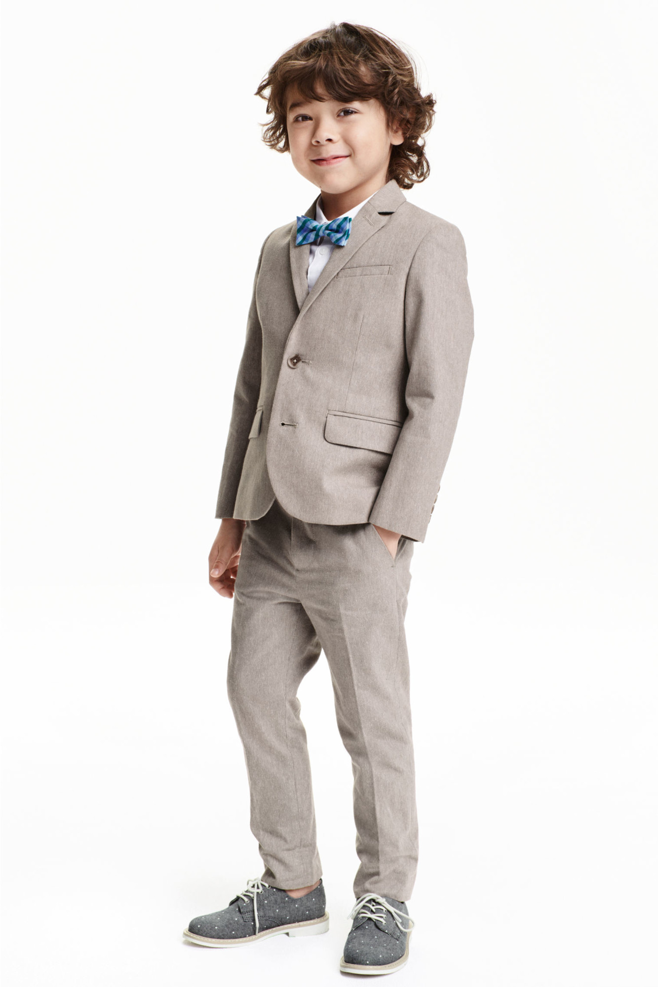 Para los "hombrecitos" de la casa: traje de tres piezas en color azul celeste en algodón que incluye pantalón recto (19,99 euros), americana clásica (29,99 euros) y chaleco de vestir (19,99 euros) de H&M. Disponible en azul celeste, beige y con estampado de rayas.