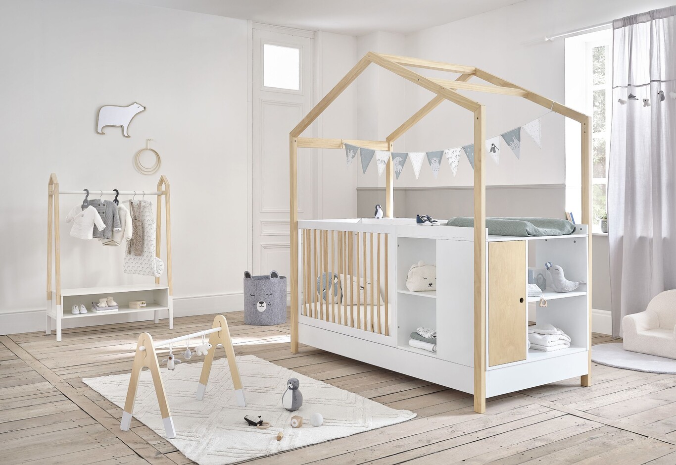 Mueble todo en uno, con una cuna 60x120 con somier regulable en altura, un mueble cambiador y una biblioteca. Este conjunto evoluciona y se transformará en tres muebles independientes cuando tu hijo crezca. Su precio 659 euros.