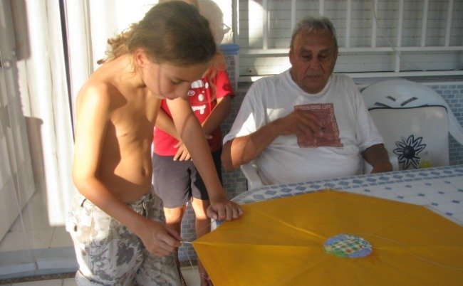 Cuando era niña mi abuelo me enseñó a hacer una cometa como él la hacía de niño. Este verano ha sido el abuelo de mi hijo el que se lo ha enseñado a él.