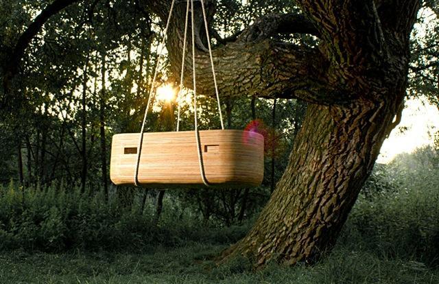 Se trata de un diseño del holandés Joost van Veldhuizen, una pieza de madera hecha a mano. Cada cuna está fabricada en la finca que el autor posee, con sus árboles, esculpiendo de un bloque de madera macizo la cuna hasta llegar a la forma final.