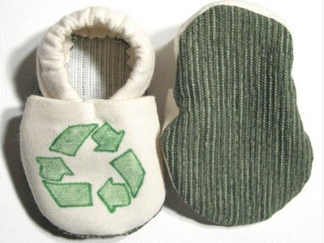 Son una creación realizada en materiales crudos de algodón orgánico con suelas de pana recuperada y están cosidos con hilo de algodón orgánico. Para darle un toque original se les ha pintado a mano un símbolo de reciclaje con tintas no-tóxicas pigmentadas a base de agua.