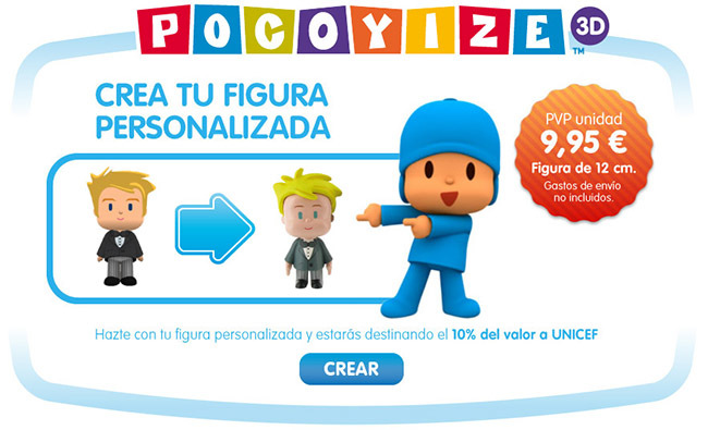 La figura resultante mide 12 cm y cada una cuesta 9,95 € sin contar con los gastos de envío. El 10% del valor de cada figura irá destinado a Unicef para luchar contra la desnutrición infantil. Por esta razón se ha iniciado una campaña para dar a conocer el pocoyizador en tres dimensiones con el apoyo de personajes conocidos como Santi Millán, la presentadora Berta Collado y el ex-futbolista Milinko Pantic, entre otros.