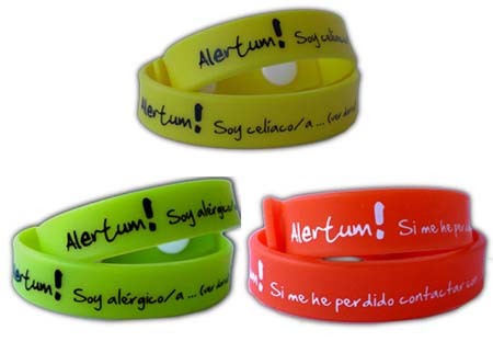 Son pulseras de goma serigrafiadas para niños de entre 1 y 12 años con doble cierre especiales para celíacos, alérgicos, diabéticos, niños con otro tipo de enfermedades o cualquier situación que deba darse a conocer.